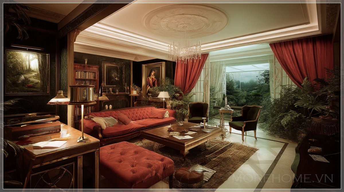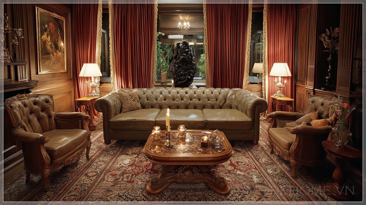 Không gian phòng khách kiểu này thường rất biết "nói ít, nhưng đủ". Màu sắc chủ đạo có thể nghiêng về các tông trầm – nâu, xám, xanh rêu – giúp mọi vật thể trở nên rõ ràng hơn trong khung hình tổng thể. Ánh sáng không quá rực rỡ mà thiên về tán xạ nhẹ nhàng, nhấn vào các góc có chất liệu đặc biệt như nhung, kính hoặc đá tự nhiên. Bức tường phía sau sofa thường đóng vai trò nền chính trong bố cục, có thể được trang trí bằng hệ phào chỉ nhẹ, một mảng tranh nghệ thuật đơn sắc hoặc đơn thuần là sự kết hợp giữa ánh sáng và kết cấu vật liệu.