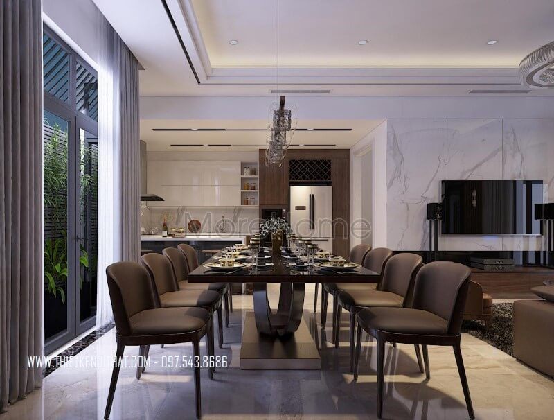 Bộ bàn ghế ăn lớn được bố trí trong một không gian rộng mở của biệt thự, nhà phố là tâm điểm của toàn bộ căn phòng hiện đại.