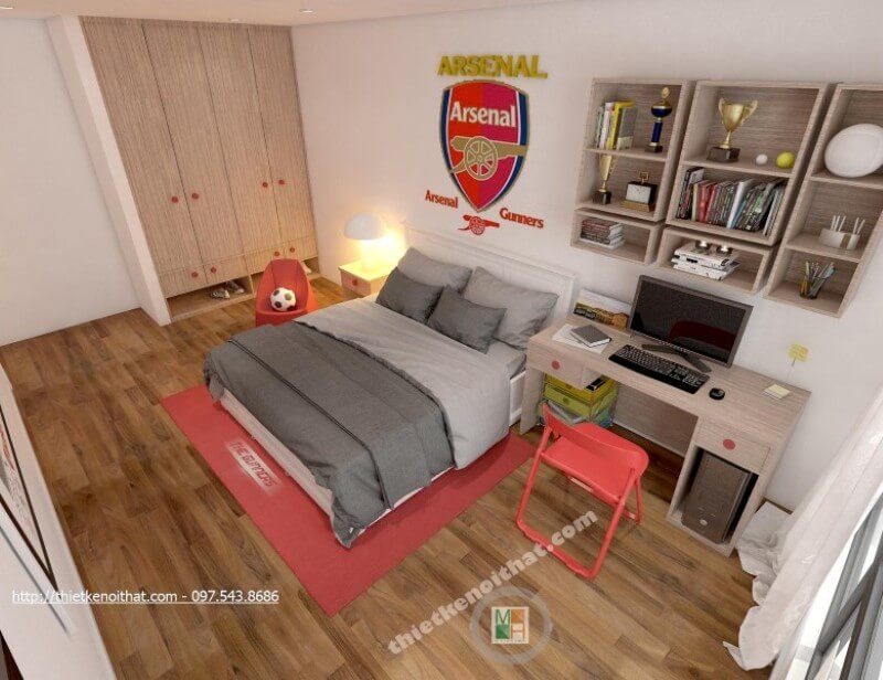 Bàn làm việc gỗ công nghiệp được thiết kế liền kề với giường ngủ, gia chủ có thể làm việc và nghỉ ngơi thoải mái, nhanh chóng hơn
