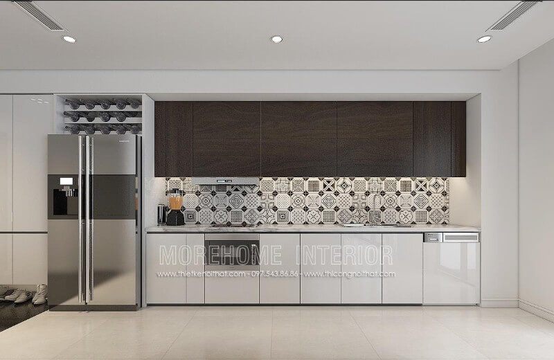 Thiết kế tủ bếp gỗ công nghiệp kịch trần giúp tận dụng không gian để đồ phía trên, rất phù hợp với không gian nhà phố, chung cư nhỏ
