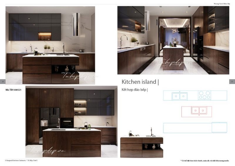 Sự kết hợp hài hòa giữa tone màu trầm ấm và màu trắng tinh tế, mẫu tủ bếp gỗ công nghiệp mang đến cho người nội trợ một không gian nấu nướng sang trọng hơn bao giờ hết