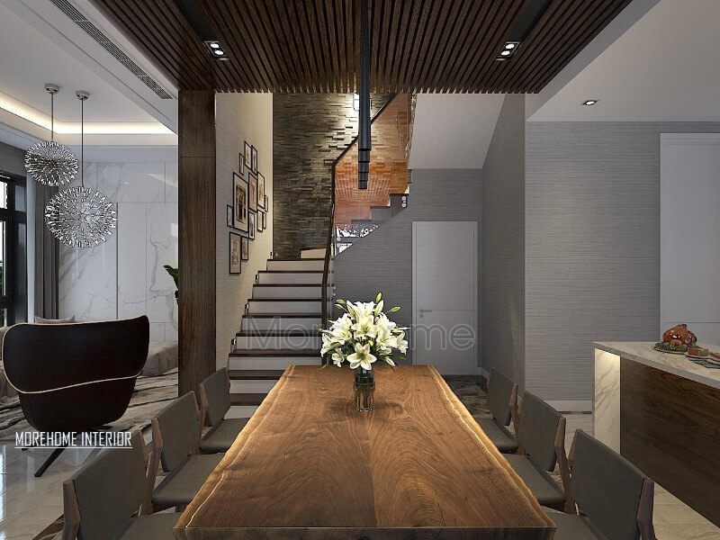 Bộ bàn ghế ăn lớn được bố trí trong một không gian rộng mở của biệt thự, nhà phố là tâm điểm của toàn bộ căn phòng hiện đại.