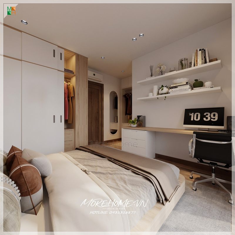 Thiết kế phòng ngủ đẹp với hệ thống kệ gỗ và tủ đồ được thiết kế và sắp xếp hợp lý từ đó giúp tiết kiệm không gian và tối ưu hóa sự tiện nghi cho căn phòng.