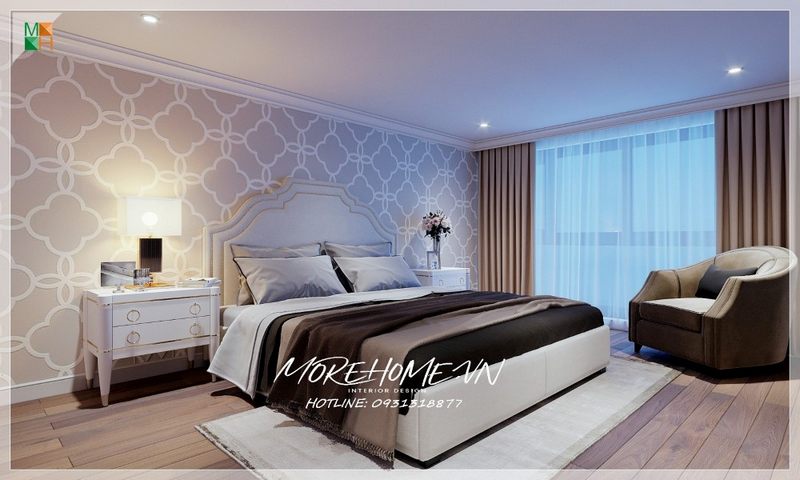 Nội thất phòng chung cư ngủ tân cổ điển thể hiện qua dáng giường, mẫu chăn ga, gối đệm, rèm buông đều mang phong cách cầu kỳ và chi tiết tỉ mỉ. Họa tiết trang trí chiếc giường được tối giản hóa nhưng vẫn hết sức lộng lẫy,ăn khớp với nội thất khác trong căn phòng ngủ mang lại 1 tổng thể hài hòa, thống nhất.