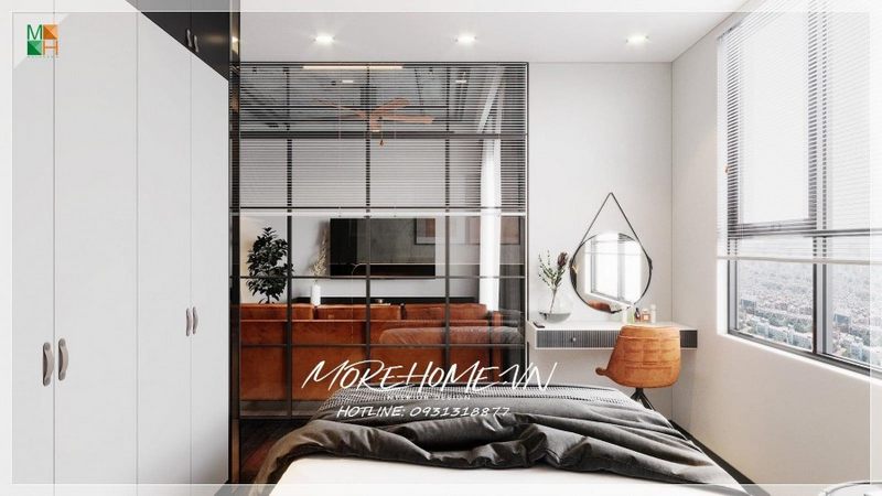Giúp cho diện tích chung cư được nới rộng với trang trí bằng vách ngăn kính trong suốt giữa phòng ngủ và phòng khách và cửa sổ. Nhận được ánh sáng tự nhiên trực tiếp vào phòng.