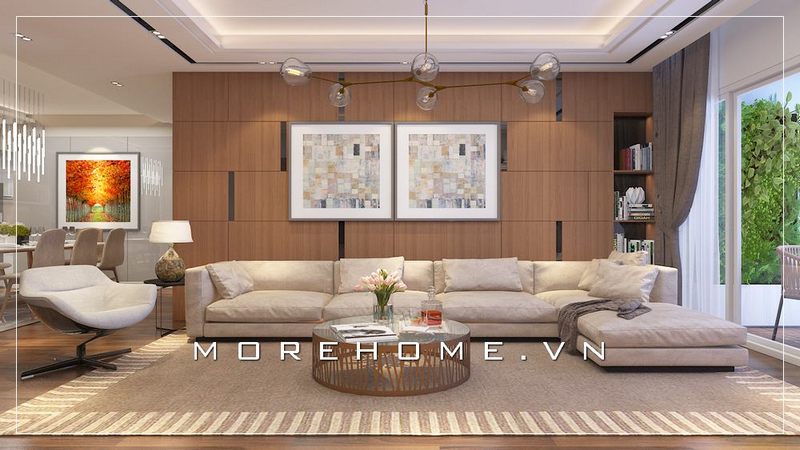 Bộ sofa chữ L màu be sữa cao cấp tạo điểm nhấn nổi bật cho không gian phòng khách chung cư