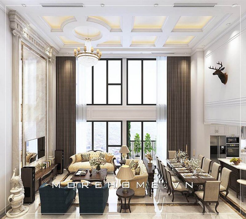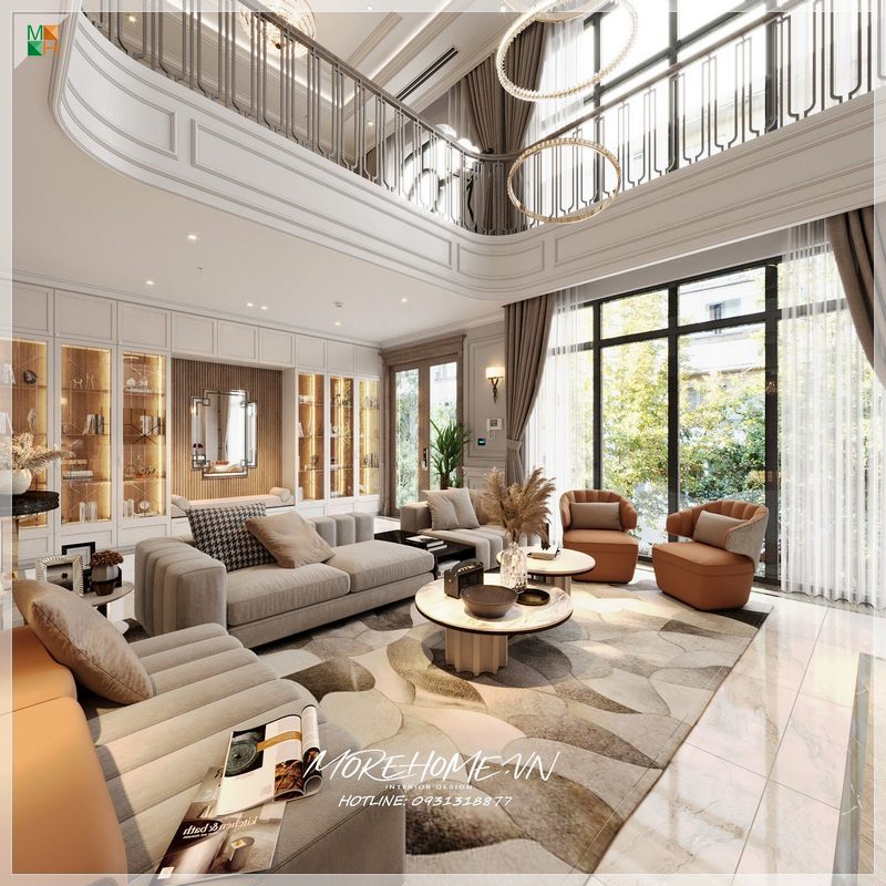 Ý tưởng sử dụng phong cách tân cổ điển đẹp cho phòng khách căn hộ chung cư thông tầng.