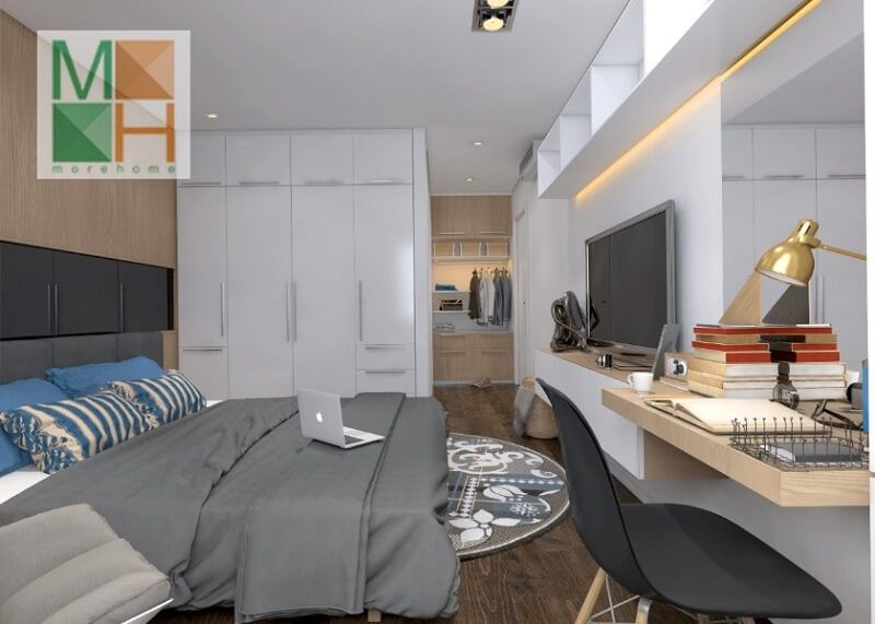 Thiết kế phòng ngủ đơn giản với đò nội thất tông màu sáng kết hợp tủ quần áo âm tường, ti vi treo tường, bàn làm việc nhỏ nhắn tiết kiệm tối đa không gian căn phòng