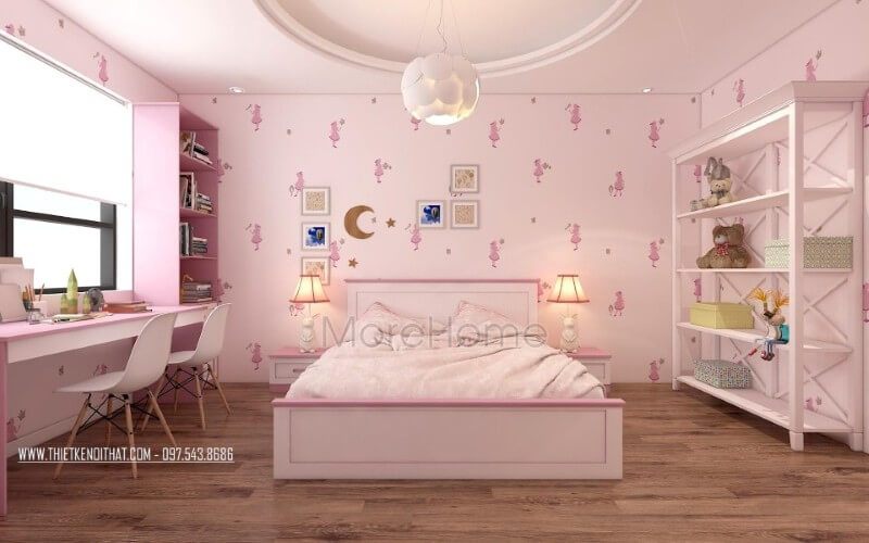 Thiết kế phòng ngủ bé gái hiện đại, nội thất gỗ công nghiệp nhẹ nhàng được bố trí hợp lí giúp bé có một không gian nghỉ ngơi và học bài tập trung, thoải mái nhất